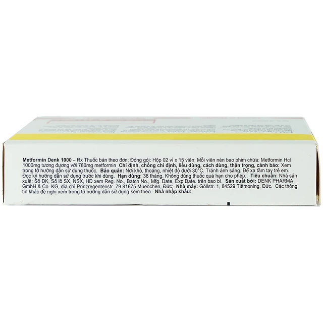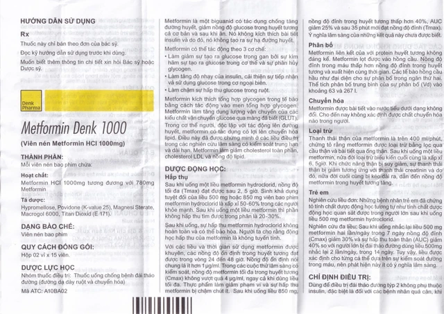 Metformin denk 1000mg của công ty DENK PHARMA GmbH & Co.KG; thành phần chính metformin hydrochloride. Thuốc dùng để điều trị đái tháo đường type II không phụ thuộc Insulin đặc biệt bệnh nhân béo phì khi chế độ ăn kiêng và tập thể dục không đủ kiểm soát đường huyết thích hợp. Metformin Denk 1000mg được chỉ định cho người lớn, trẻ vị thành niên và trẻ em trên 10 tuổi. Thuốc được dùng đơn trị liệu hay kết hợp với các thuốc điều trị đái tháo đường đường uống hay với insulin. Là thuốc được ưu tiên sử dụng sau khi chế độ ăn kiêng thất bại.